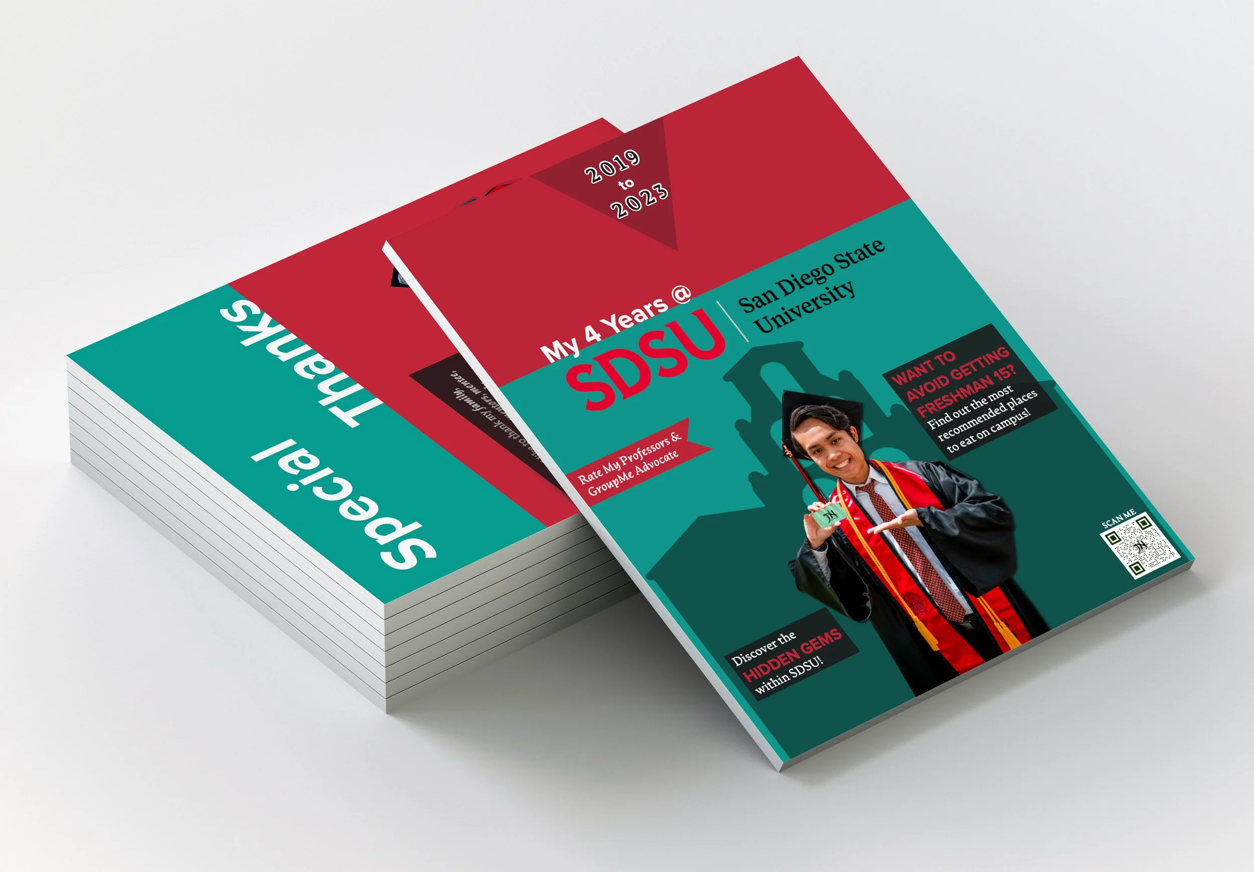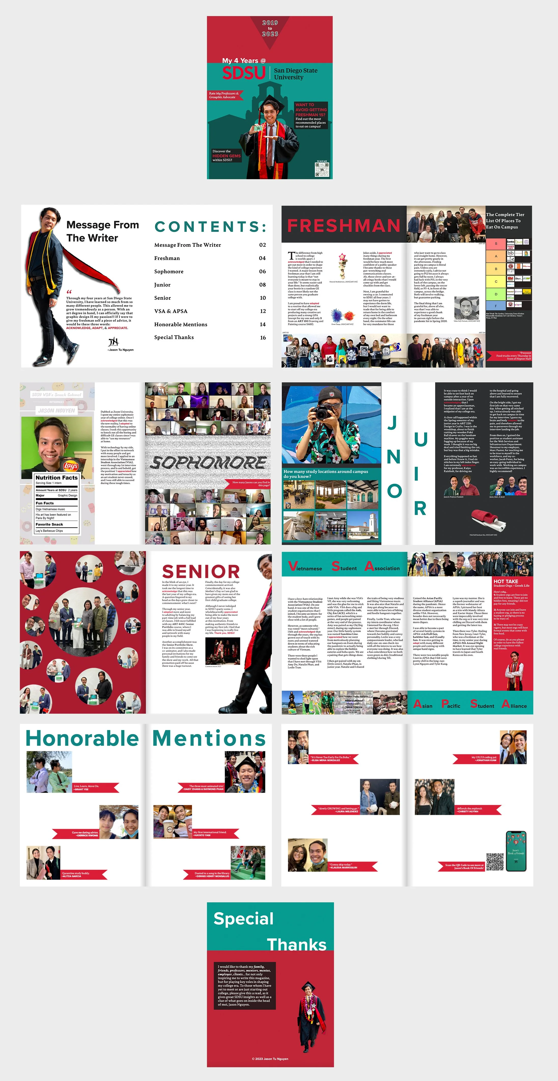 I remained faithful to SDSU’s color scheme and typeface when it comes to the design choices. The other aspect is collaging various photographs taken throughout my years on the campus. It was truly a trip down memory lane putting everything together.
