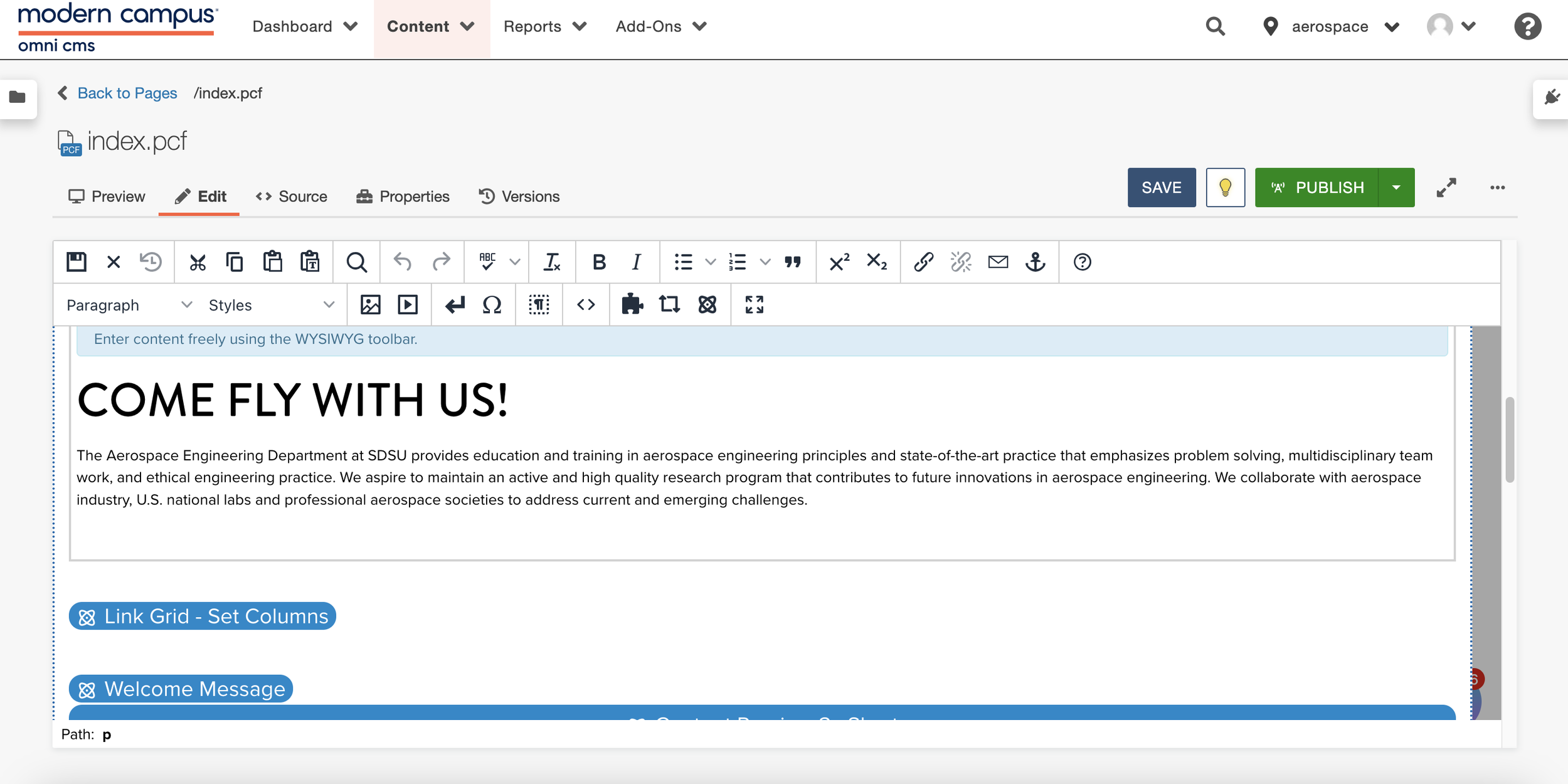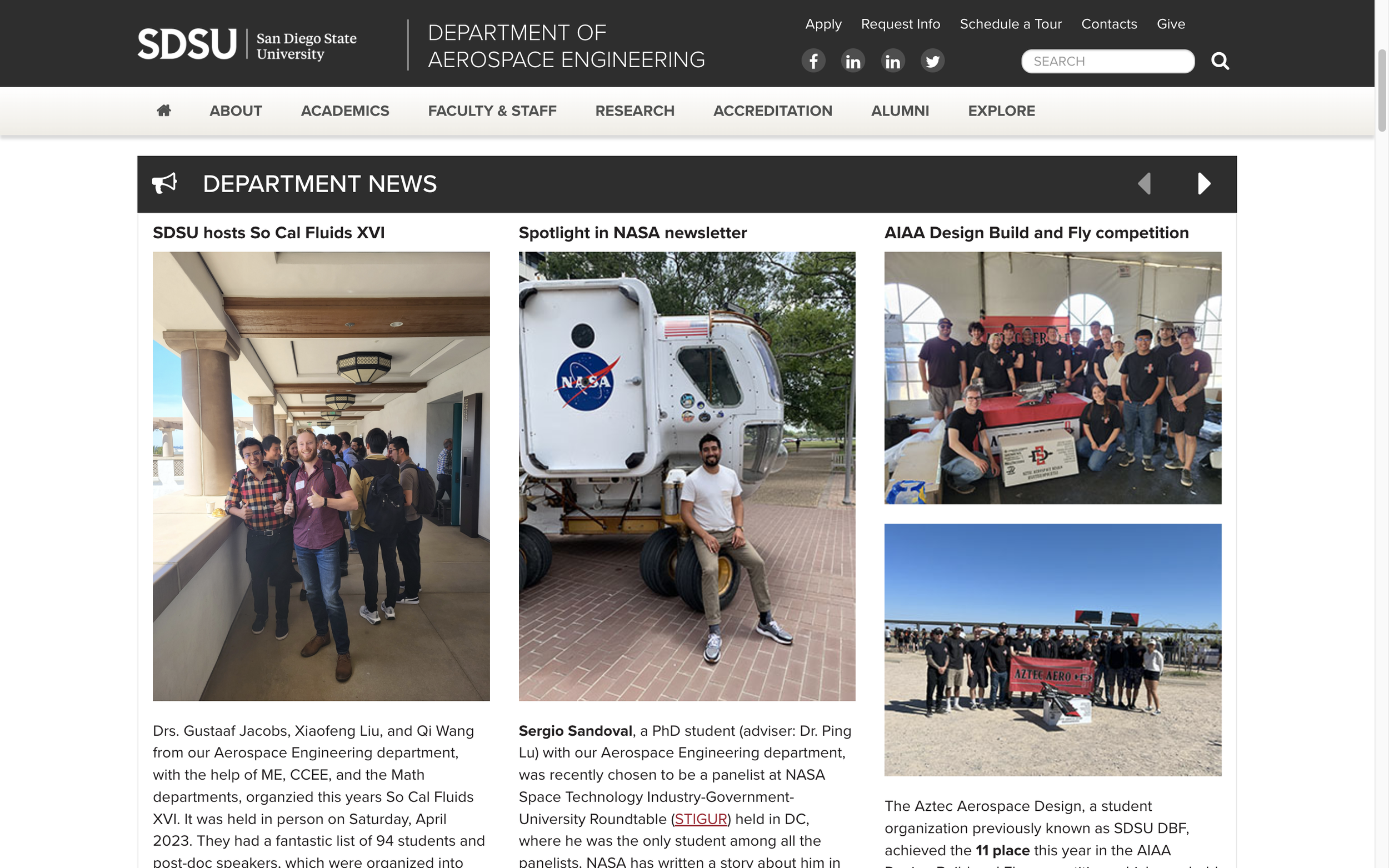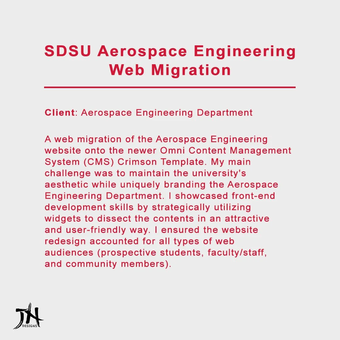 Overview: The campus’s original Aerospace Engineering website was outdated and several features were inaccessible. I led the web migration of the Aerospace Engineering website onto the newer OmniCMS Crimson Template. With the Aerospace Engineering Department as my client, I ensured the website redesign accounted for all types of web audiences (prospective students, faculty/staff, and community members.)