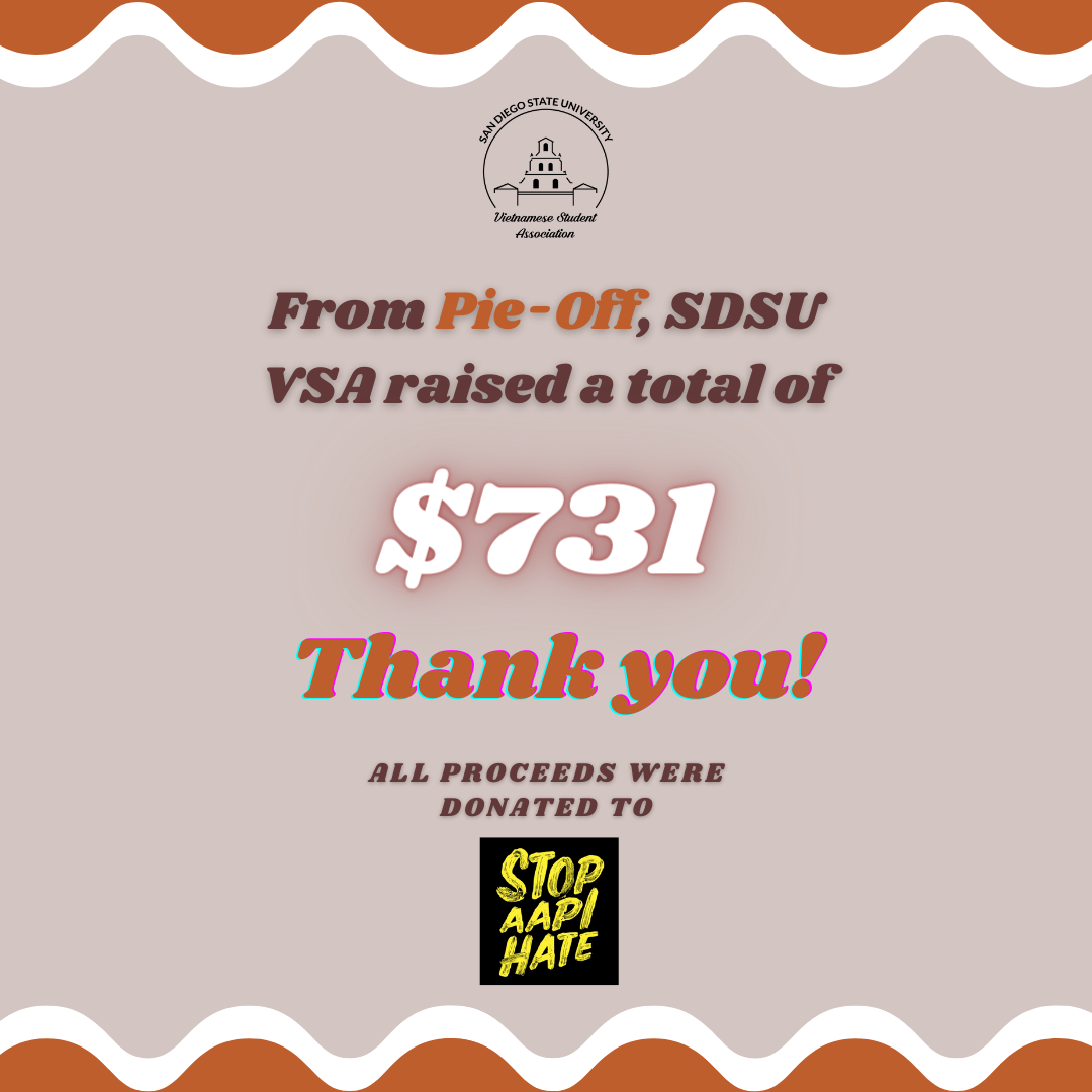 Graphics for a fundraiser known as "Pie-Off." This was streamed on Twitch during the pandemic to raise money from viewers, so that VSA can donate to the organization Stop Asian Hate, to show support and spread awareness towards the hate crimes happening in the Asian American Pacific Islander (AAPI) community. From this fundraiser, VSA raised a total of $731.